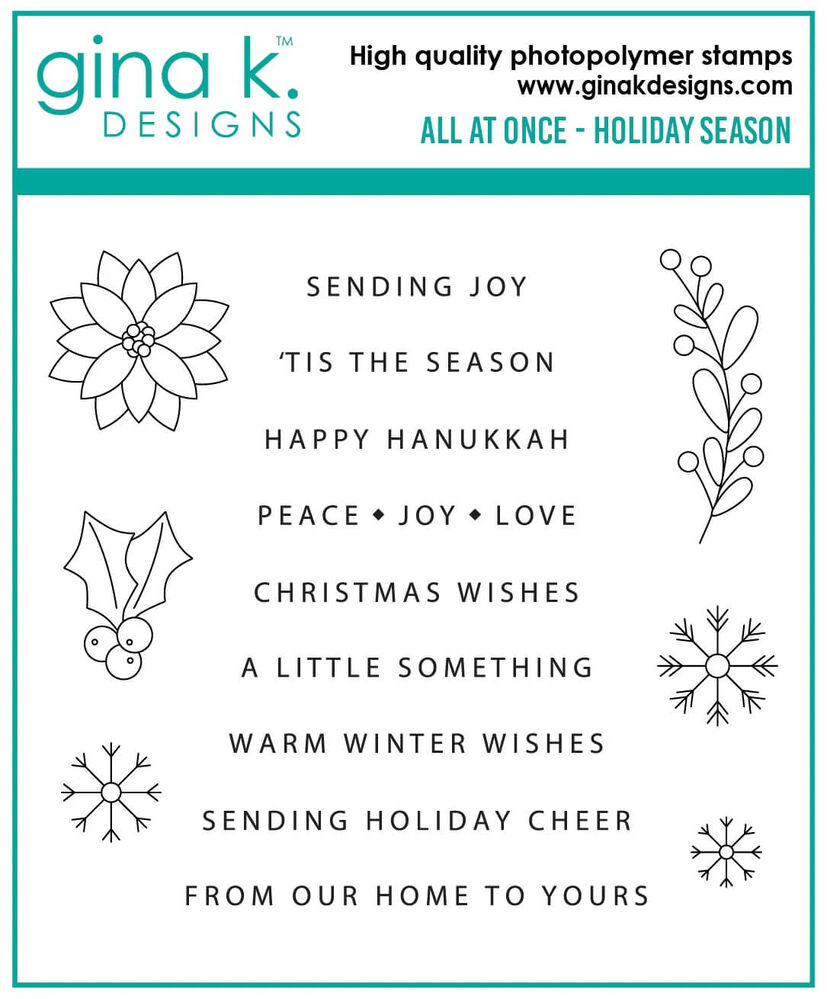 All at Once- Holiday Season is a stamp set by Gina K Designs. This set is made of premium clear photopolymer and measures 4" X 4". Made in the USA