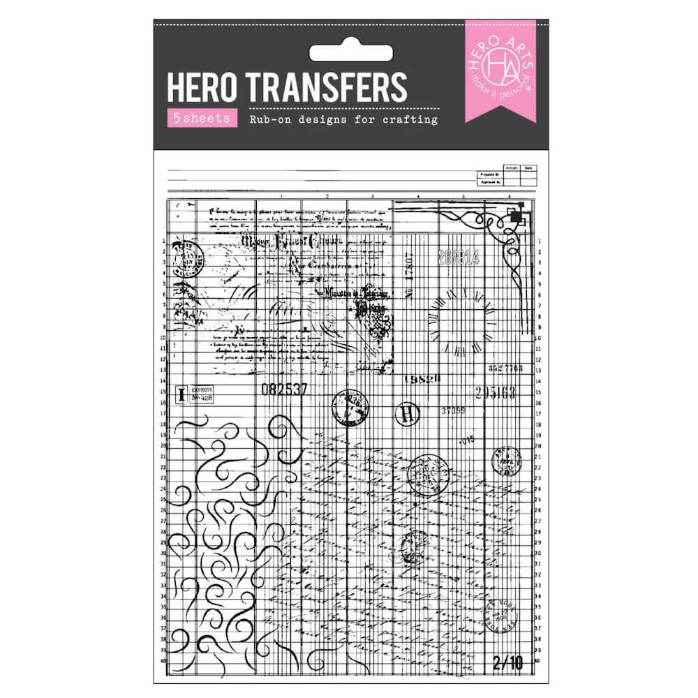 Add instant detail and creative interest to your projects with the Grids & Icons Mixed Media Hero Transfers. This set includes five different 6” x 8” patterned transfer sheets filled with grids, icons, and subtle graphic elements.