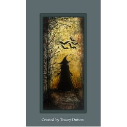 She wears a weathered cloak with its frayed, netted fibres showing at the edges and a pointed, wide-brimmed hat. Her hair is swept to the left, perhaps by an ethereal wind mustered from her incantations.