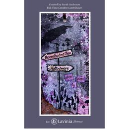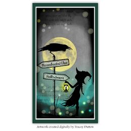 A single stamp featuring a rustic signpost at a fork in the path, its weathered planks pointing the way to the mysterious realms of Moonshadow Glen and Hallowmere.