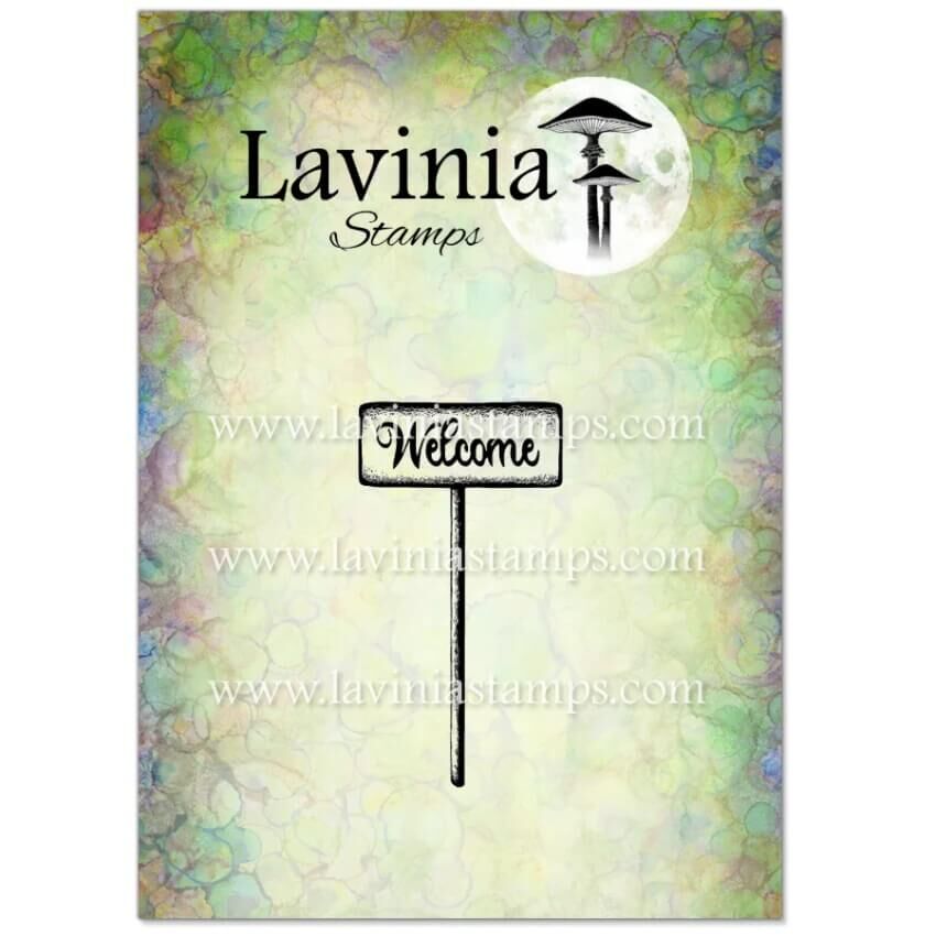 Lavinia Stamps Welcome Clear Stamp features a friendly sign with welcome in flowing, hand-drawn lettering. Perfect for placing beside a doorway or pairing with houses and dwellings to create inviting scenes.