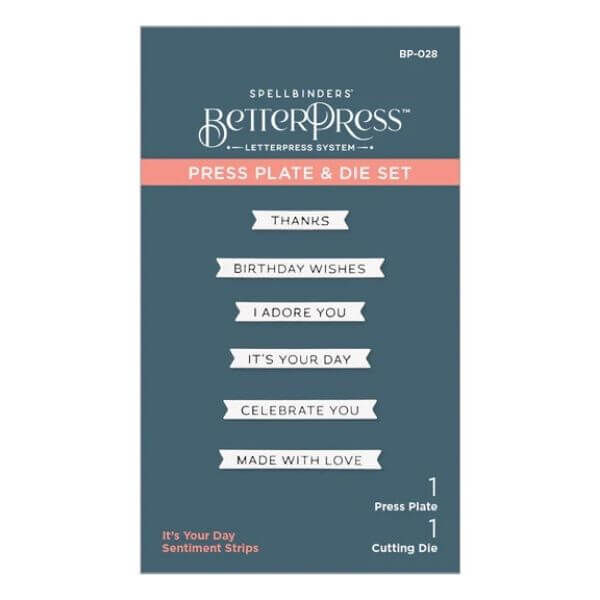It's Your Day Sentiment Strips Press Plate & Die Set is part of the BetterPress Collection by Spellbinders. This press plate has a list of six short and sweet sentiments for all occasions with a matching thin metal cutting die to cut all of them at the same time! Make them ahead of time and have them ready to go when you are. Perfect for cardmakers! Ink the plate with the BetterPress Ink to be pressed against the BetterPress Cotton Card Panel and Sheets to create a crisp letterpress design.