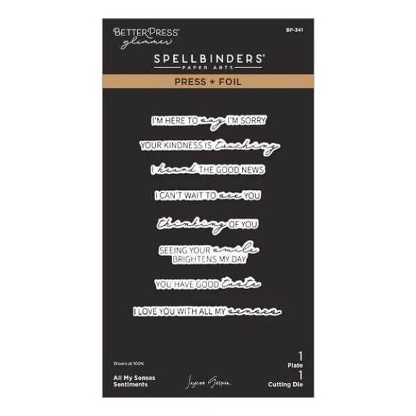 All My Senses Sentiments Press + Foil Plate & Die Set is from the All My Senses Collection by Jaycee Gaspar. This set of one plate and one thin metal cutting die impresses a list of eight sentiments and cuts each sentiment all at once – one and done! In a combination of half script and print font: I’m here to say I’m sorry, Your kindness is touching, I heard the good news, Seeing your smile brightens my day, I can’t wait to see you, You have good taste, Thinking of You and I love you with all my senses.