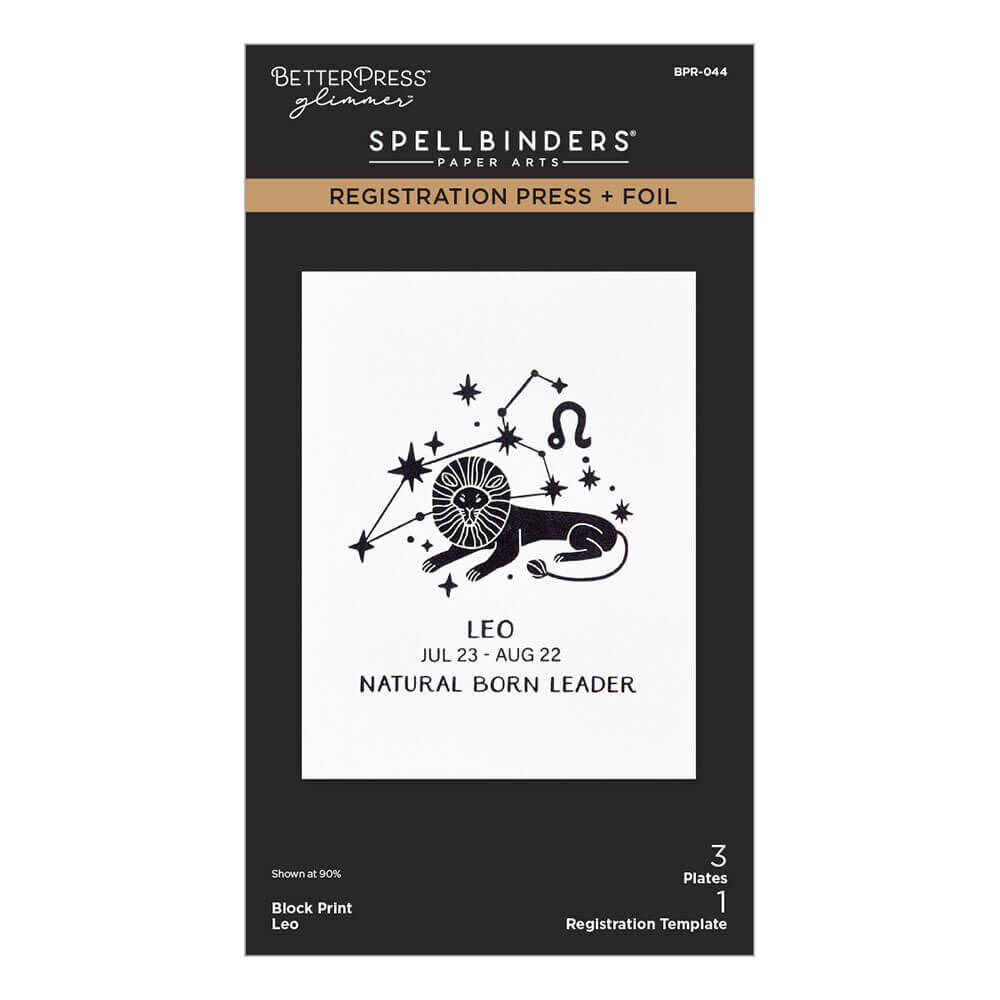 Block Print Leo Registration Press + Foil Plate is part of the Block Print Zodiacs Collection. The set of three Press + Foil plates and one acetate printed registration template come together to create a multi-color background and/or design placement of zodiac sign, Leo, its symbols, dates and traits. Note the acetate template is only for the BetterPress System and not for the Glimmer Hot Foil System which the heat will distort the acetate. The assembled Leo design measures 3.05 x 3.50 in./7.70 x 8.60 cm.