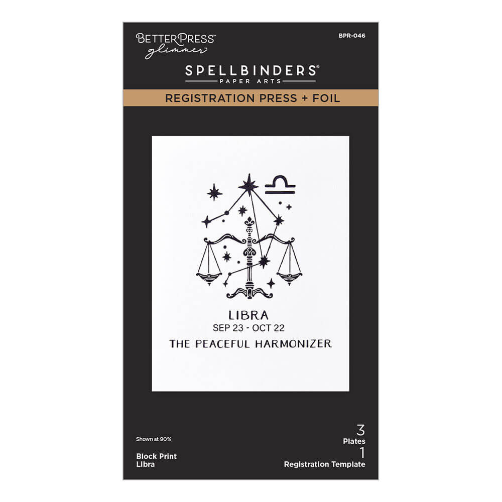 Block Print Libra Registration Press + Foil Plate is part of the Block Print Zodiacs Collection. The set of three Press + Foil plates and one acetate printed registration template come together to create a multi-color background and/or design placement of zodiac sign, Libra, its symbols, dates and traits. Note the acetate template is only for the BetterPress System and not for the Glimmer Hot Foil System which the heat will distort the acetate. The assembled Libra design measures 3.45 x 3.70 in./8.80 x 9.40 cm.