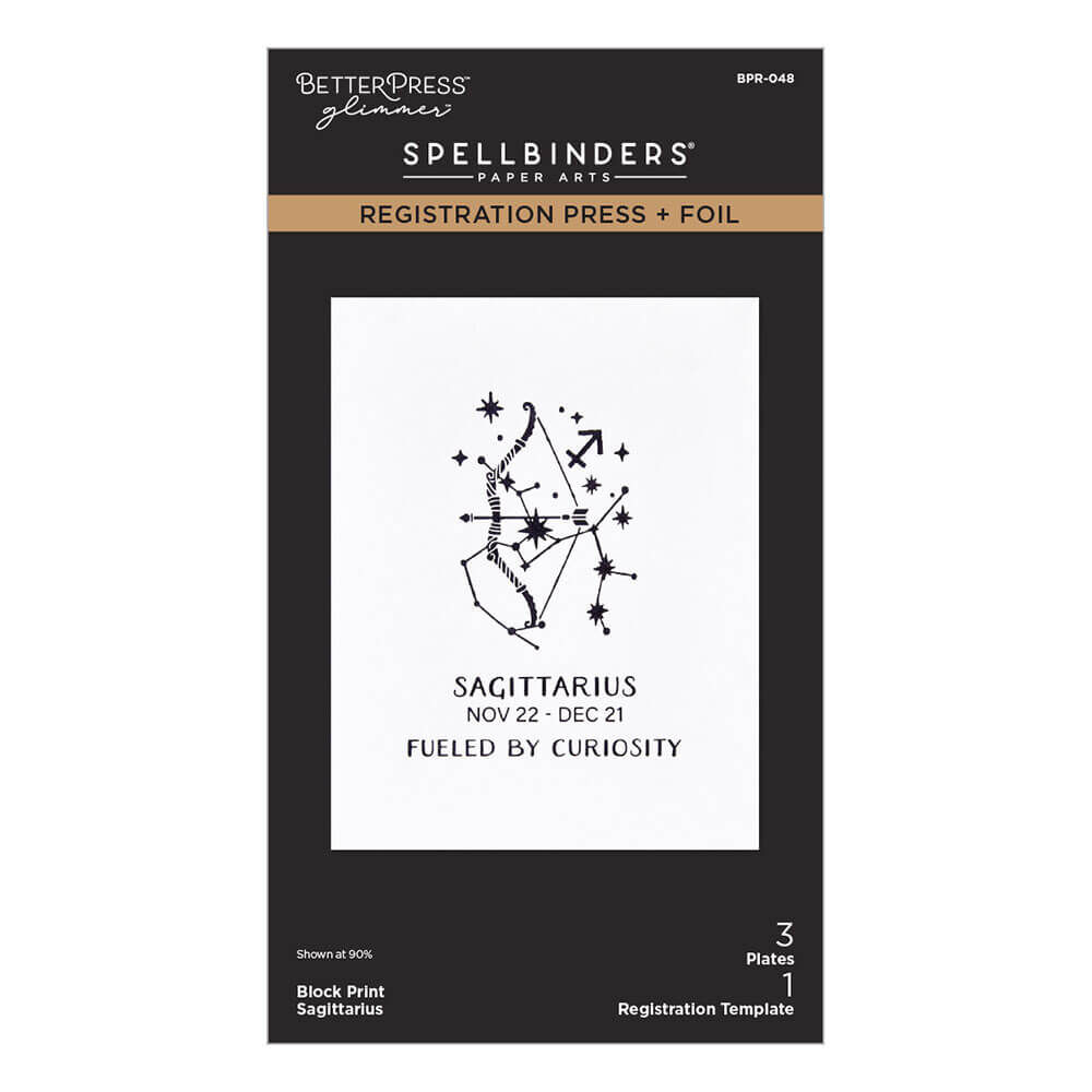 Block Print Sagittarius Registration Press + Foil Plate is part of the Block Print Zodiacs Collection. The set of three Press + Foil plates and one acetate printed registration template come together to create a multi-color background and/or design placement of zodiac sign, Sagittarius, its symbols, dates and traits. Note the acetate template is only for the BetterPress System and not for the Glimmer Hot Foil System which the heat will distort the acetate. The assembled Sagittarius design measures 2.70 x 3.60 in./6.80 x 9.10 cm.