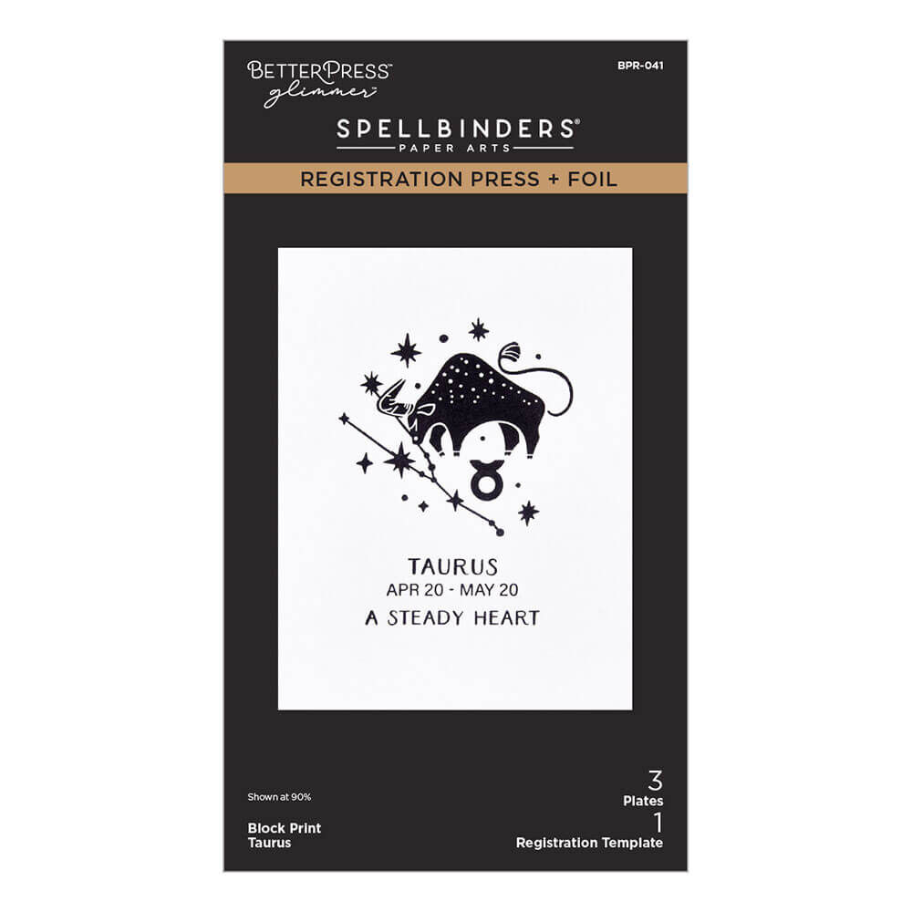 Block Print Taurus Registration Press + Foil Plate is part of the Block Print Zodiacs Collection. The set of three Press + Foil plates and one acetate printed registration template come together to create a multi-color background and/or design placement of zodiac sign, Taurus, its symbols, dates and traits. Note the acetate template is only for the BetterPress System and not for the Glimmer Hot Foil System which the heat will distort the acetate. The assembled Taurus design measures 2.75 x 3.60 in./6.90 x 9.10 cm.