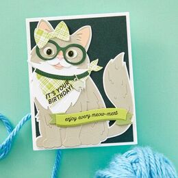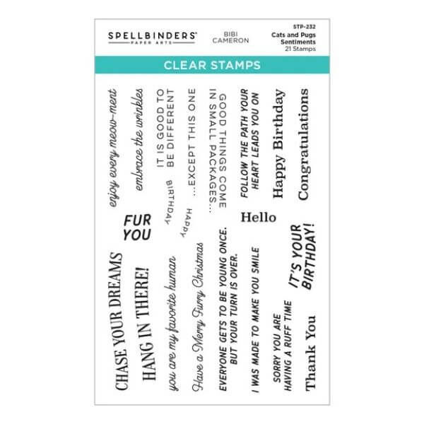 Cats and Pugs Sentiments Clear Stamps are part of the Bibi's Cats and Pugs Collection by Bibi Cameron. The set of 21 clear stamp phrases that not only can be used as sentiments, but some are designed to fit accessories in the collection, like the banana, glasses, and banners. What a great and versatile set! They are designed to work with an acrylic block and made in the USA.