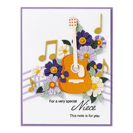 Mini Guitar Etched Dies are part of the Bibi's Musical Notes Collection by Bibi Cameron. When assembled, this set of 11 thin metal cutting dies makes an amazing guitar, along with floral accents to make it even lovelier!