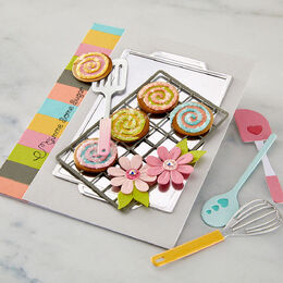 Cool It Cookie Rack Etched Dies are part of the Make It & Bake It Collection by Tina Smith. The set of 21 thin metal cutting dies brings to life four different cookie shapes, matching toppings and a cookie sheet + rack! Add the word 'enjoy' with its outline to convey a greeting. Accent the sentiment with a floral accent. So much to use in this set!