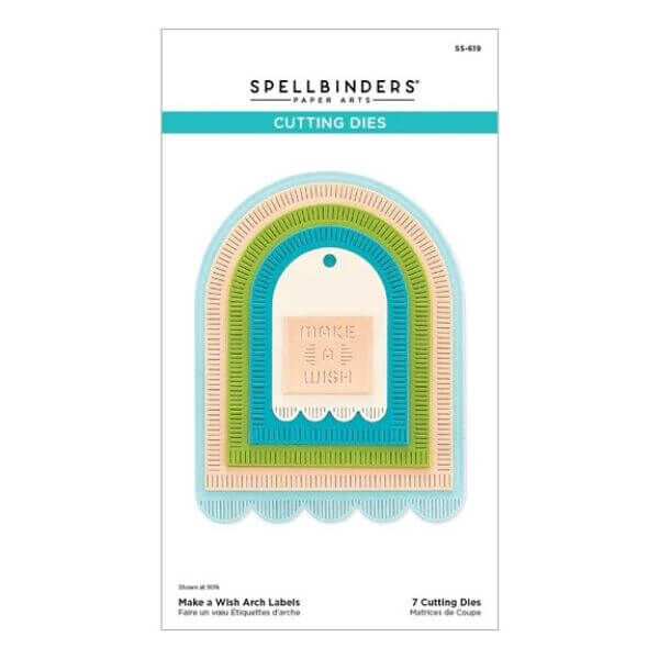 Make a Wish Arch Labels Etched Dies is part of the Monster Birthday Collection and a beautiful set of seven thin metal cutting die with intricate arch shapes. The largest arch cuts a scalloped bottom with its blanket stitch edging. The other four arches all have blanket stitch around its edges. The smallest mimics the largest arch but in a small tag shape. The arch shapes frames and anchors any card creation.