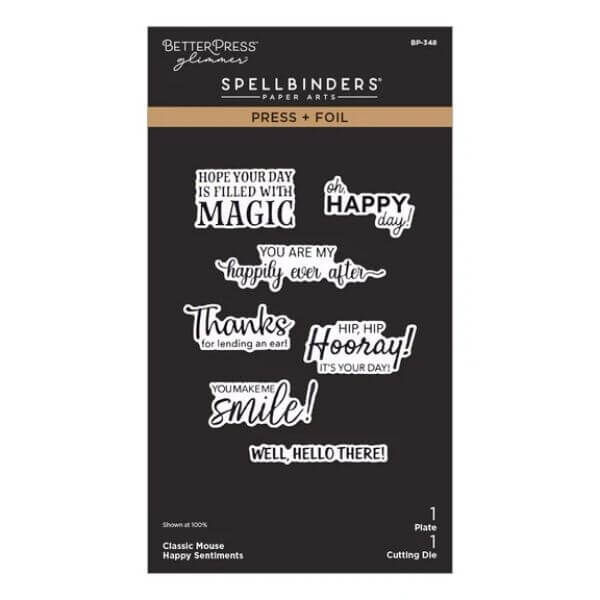 Classic Mouse Happy Sentiments Press + Foil Plate & Die Set is part of the Classic Mouse Love Collection. This set is a great time saver when it comes to making sentiments! The one Press & Foil plate imprints and/or foils seven sentiments at the same time. The matching thin metal cutting die cuts each sentiment perfectly and with love! Sentiments include You are my happily ever after, Hope your day is filled with magic, You make me smile!, Hip Hip Hoooray! It’s your day!, Thanks for lending an ear!, Oh happy day!, and Well Hello There!